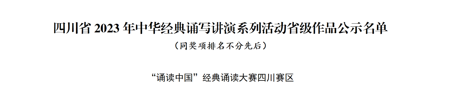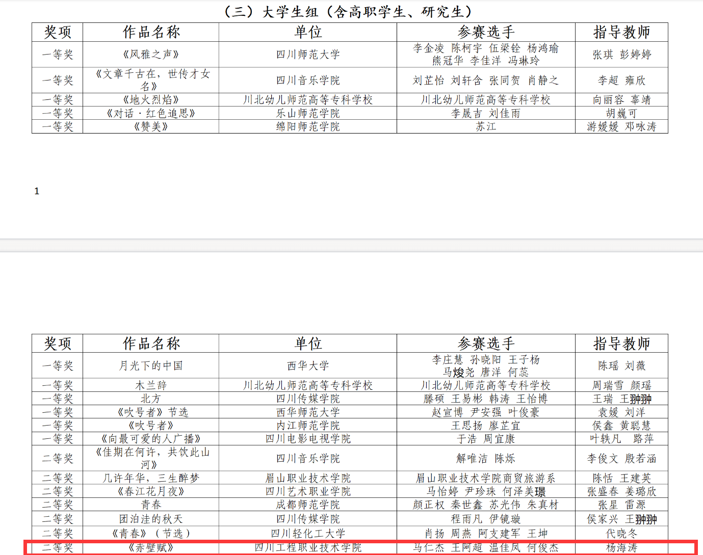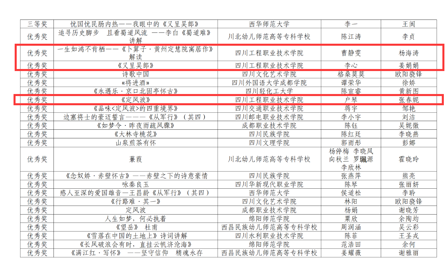 9月22日,由四川省委宣传部、省语委、省委教育工委、教育厅共同主办的四川省2023年中华经典诵写讲演系列活动省级作品进行获奖公示。在本次大赛中,基础教学部教师杨海涛指导马仁杰等四位学生参赛的朗诵作品《赤壁赋》获得“诵读中国”经典诵读大赛四川赛区大学生组二等奖,杨海涛老师指导曹静雯同学参赛的作品“一生如鸿不肯栖——《卜算子·黄州定慧院寓居作》解读”、姜娟娟老师指导李心同学参赛的作品《又呈吴郎》以及张春妮老师指导户琴同学参赛的作品《定风波》获“诗教中国”诗词讲解大赛四川赛区大学生组优秀奖。