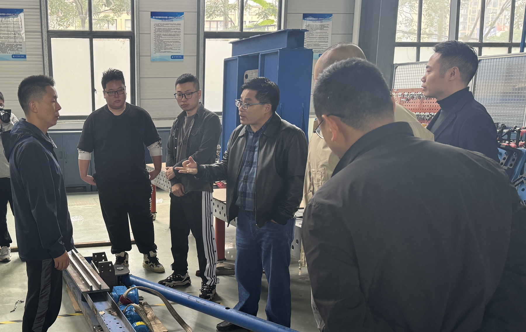 液压爬模项目2期合作旨在进一步提升液压爬模系统性能。四川交建集团工作人员在机器人工程实验室总工雷刚等人的陪同下,观看了新设备的现场测试情况,并详细询问了设备的相关参数指标。随后,双方在L车间会议室对技术方案进行了进一步磋商,并就下一步的具体工作达成共识。(文/图 电气信息工程系)