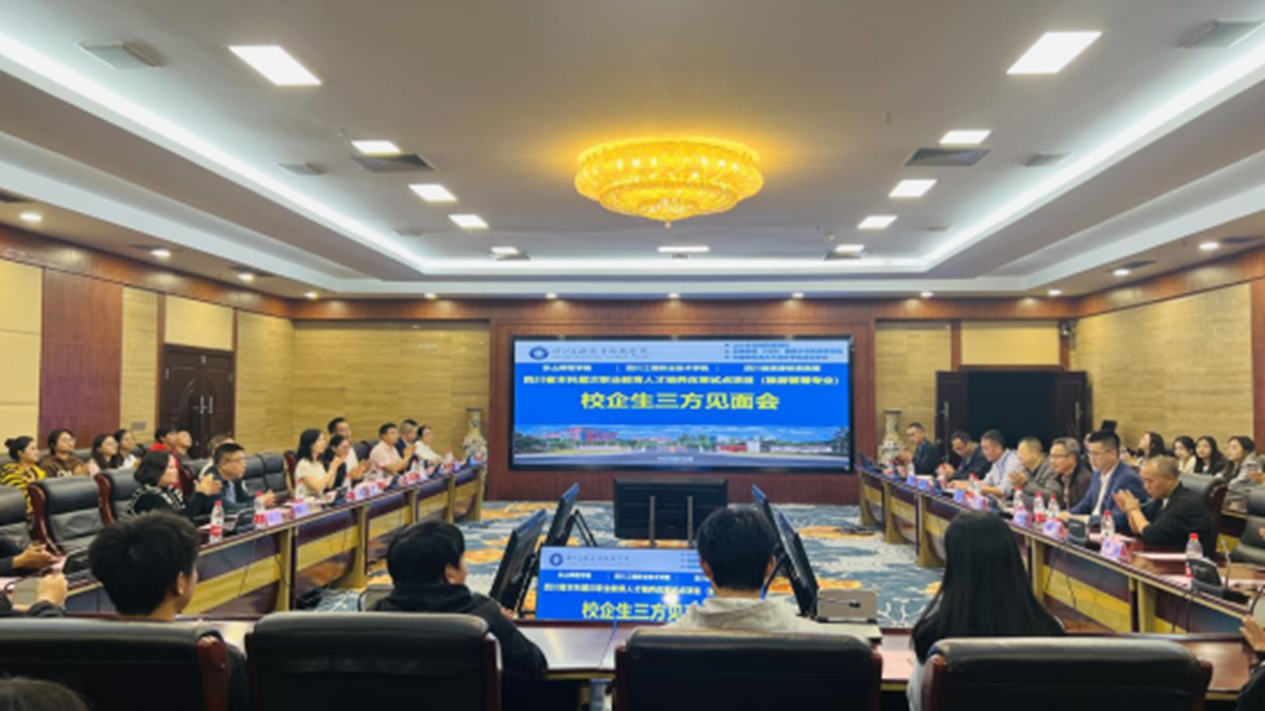 为贯彻落实《国家职业教育改革实施方案》,创新高层次技术技能人才培养模式,根据《四川省教育厅关于开展2022年本科层次职业教育人才培养改革试点工作的通知》,四川工程职业技术学院与乐山师范学院、四川省旅游投资集团有限责任公司联合开展了本科层次职业教育人才培养改革试点项目(旅游管理专业)。为了解学生学习情况、提高人才培养质量,近日,我校与乐山师范学院、四川省旅游投资集团在图书馆108会议室举行了校企生三方见面会。两校领导、集团代表以及2023级旅游管理专业本科班全体学生参与了此次会议。
