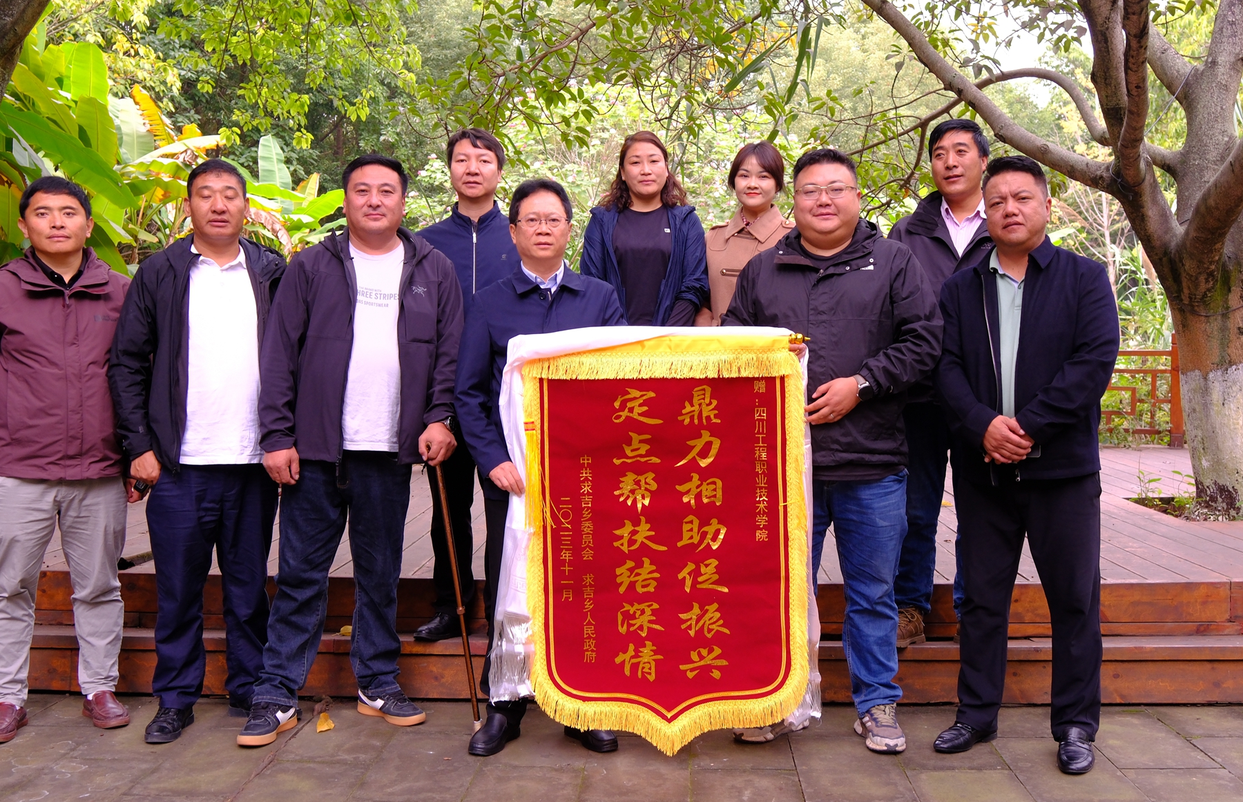 尹波书记介绍了学校派驻求吉乡麻藏村、甲吉村和上黄寨村帮扶的5名驻村队员工作开展情况,对学校长期帮扶求吉乡表示衷心感谢,为学校献上了锦旗,并诚挚希望学校在推动求吉乡的乡村振兴工作中能给予更多的帮助和支持。李登万书记表示,学校与求吉乡并肩战斗、携手奋进,既共同推进了乡村振兴的探索与实践,也结下了弥足珍贵的深厚情谊,下一步,学校将继续发挥人才和智力优势,充分利用求吉乡山、水、土地和红色文化资源,帮助发展特色产业,在推动乡村振兴上作出更有成效的贡献。