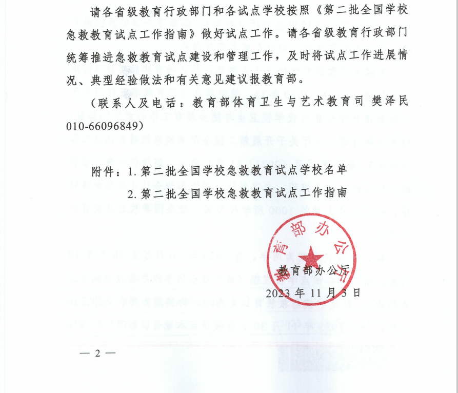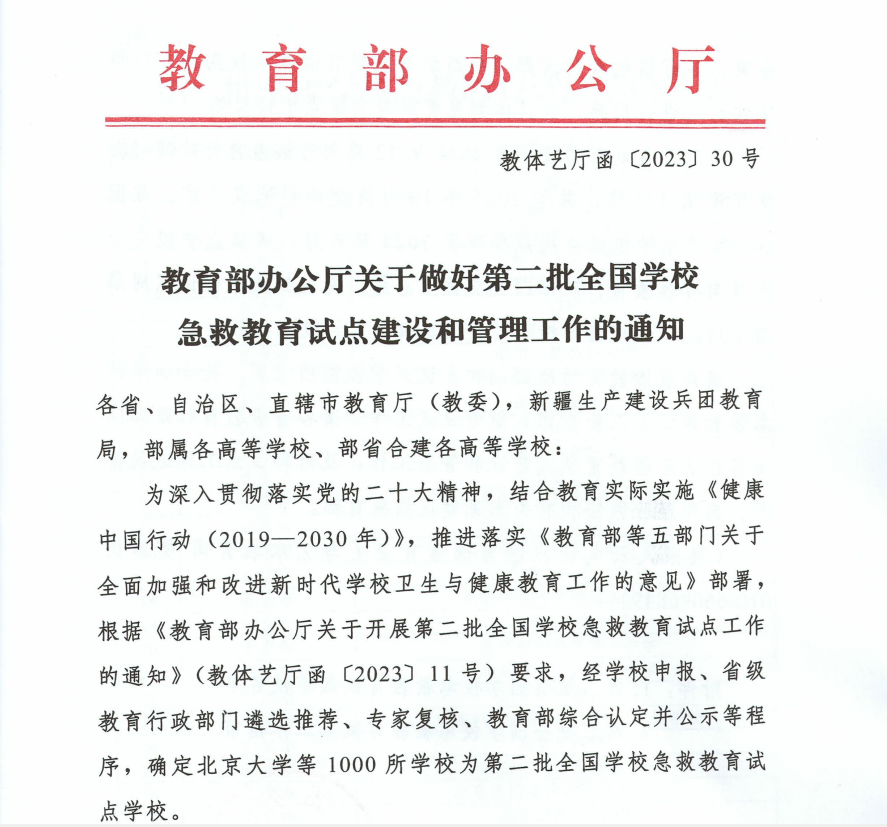 2021年10月,为深入实施《教育部等五部门关于全面加强和改进新时代学校卫生与健康教育工作的意见》提出的实施青少年急救教育行动计划,加强学校急救教育,保护青少年生命健康,培养青少年和教职员工乐于施救、敢于施救、善于施救的意识和能力,教育部决定实施青少年急救教育行动计划,开展全国学校急救教育试点工作。2022年1月,确定北京理工大学等201所学校为首批全国急救教育试点学校。2023年3月,教育部办公厅发布《关于开展第二批全国学校急救教育试点工作的通知》,积极推进第二批全国学校急救教育试点工作。