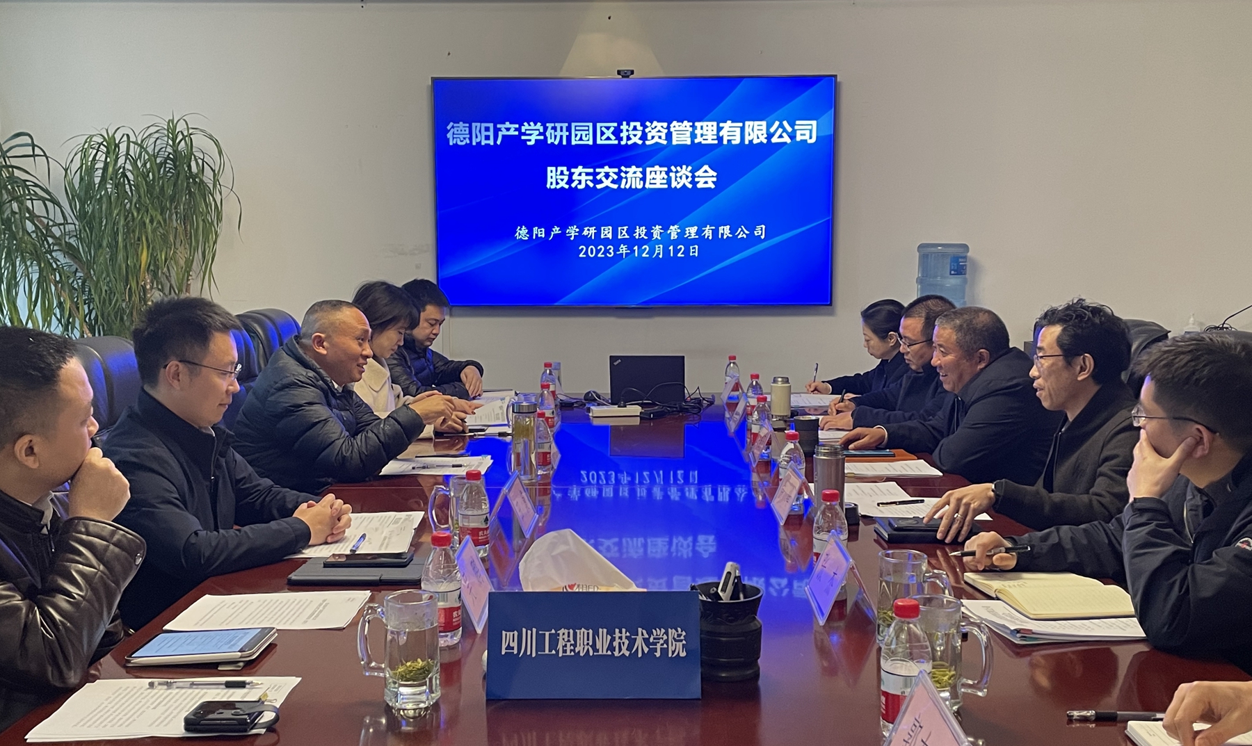 12月12日上午,德阳产学研园区投资管理有限公司(以下简称“园区公司”)股东交流座谈会在行政楼203会议室召开。学校党委书记李登万,党委副书记、院长肖峰,副院长郭杰,四川振兴产业园实业有限公司董事长刘怀笔、副总经理蒋楠出席了交流座谈会。
