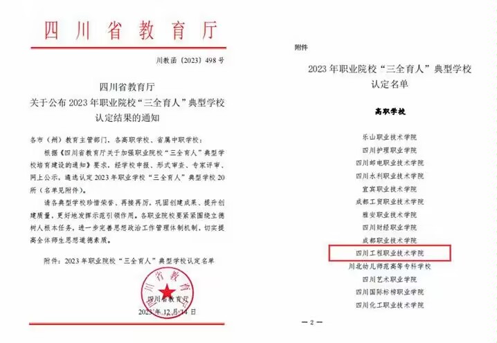 12月14日,四川省教育厅公布了2023年职业院校“三全育人”典型学校认定结果,经积极申报、形式审查、专家评审、网上公示等环节,我校被认定为2023年职业院校“三全育人”典型学校。省教育厅此次共遴选认定职业院校“三全育人”典型学校20所。