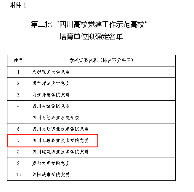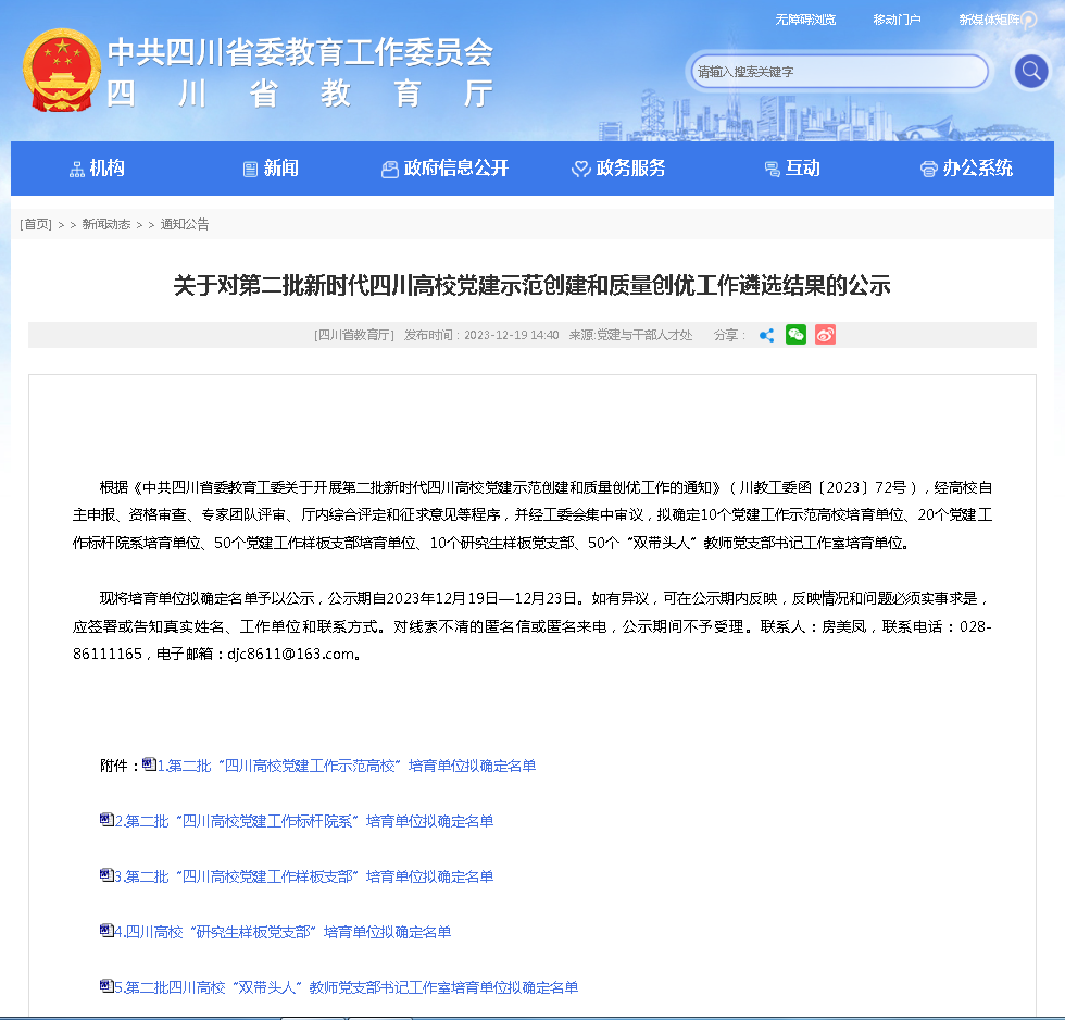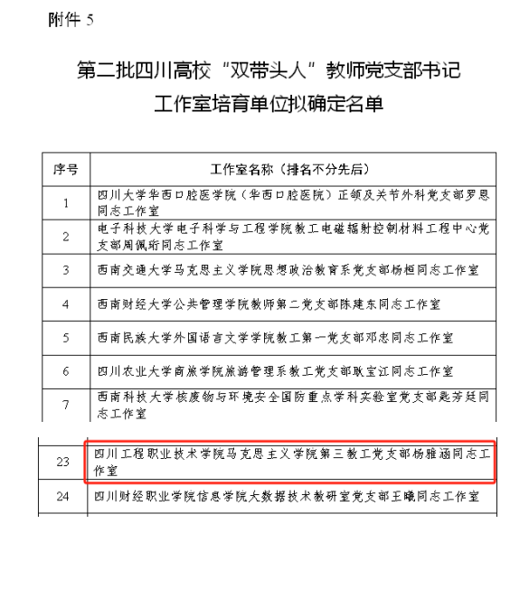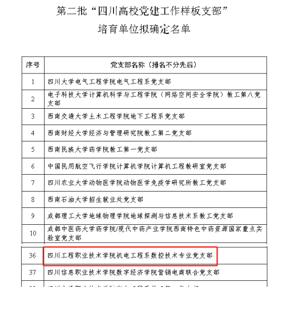 近日,四川省委教育工委发布了《关于对第二批新时代四川高校党建示范创建和质量创优工作遴选结果的公示》。经过遴选,全省拟确定10个党建工作示范高校培育单位、20个党建工作标杆院系培育单位、50个党建工作样板支部培育单位、10个研究生样板党支部、50个“双带头人”教师党支部书记工作室培育单位。其中,我校拟确定为“四川高校党建示范高校”培育单位,机电工程系数控技术专业党支部拟确定为“四川高校党建工作样板支部”培育单位,马克思主义学院第三教工党支部杨雅涵同志工作室拟确定为“四川高校‘双带头人’教师党支部书记工作室”培育单位。目前公示期已结束。