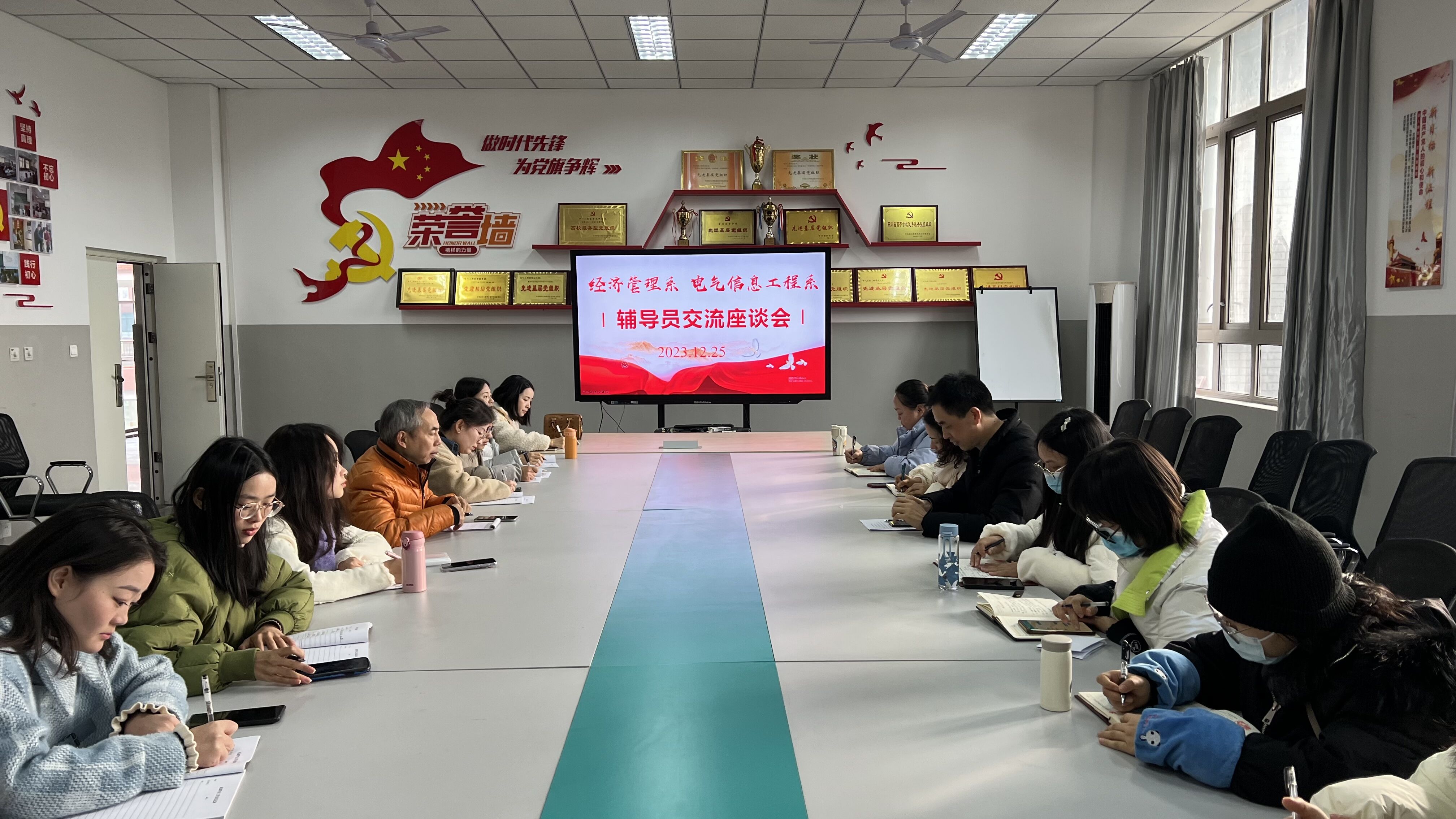 12月25日下午,建筑系、旅游系、健管系、材料系和艺术系联合召开先进班集体暨学生工作经验交流会,交流会在艺术系党建活动室举办。
