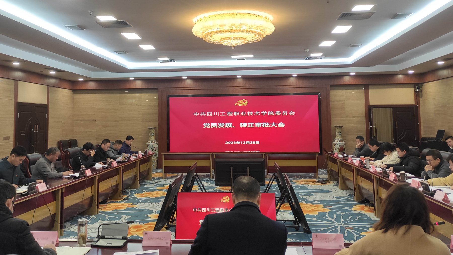 为加强学校党员队伍建设,严把党员发展质量关,按照发展党员工作计划,12月28日,学校党委在图书馆108会议室召开党员发展、转正审批大会,对2023年下半年接收新党员和预备党员转正事宜进行审议。学校党委书记李登万,党委副书记、院长肖峰和其他在校的党委常委,各党总支(直属党支部)书记、专职组织员等近40名同志参加会议。会议由党委常委、组织部部长邱黎明主持。