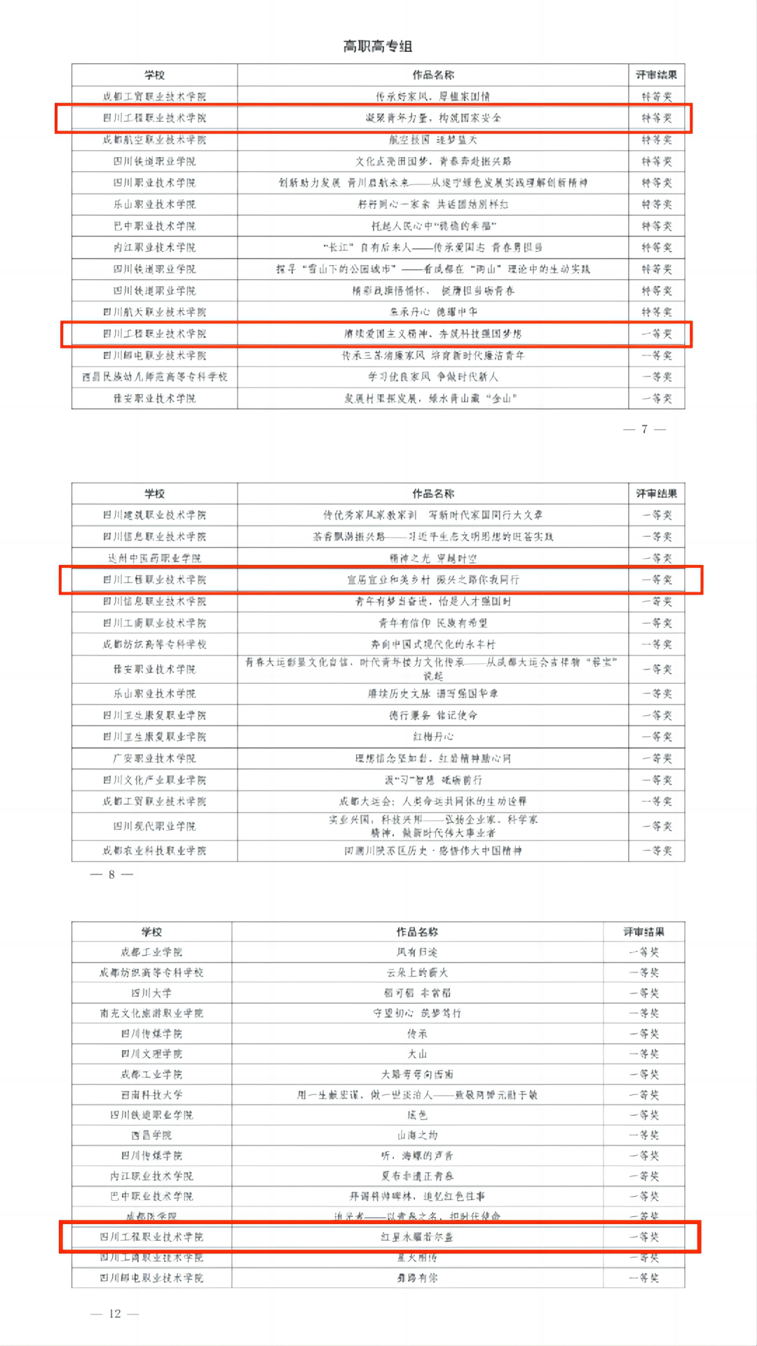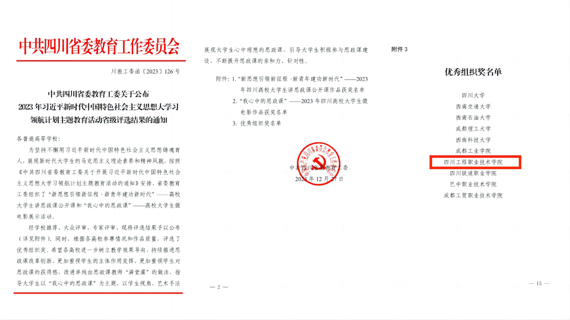 在“新思想引领新征程 新青年建功新时代”——2023年四川省高校大学生讲思政课公开课作品展示评比中,我校作品《凝聚青年力量,构筑国家安全》荣获高职高专组特等奖;作品《赓续爱国主义精神,夯筑科技强国梦想》荣获高职高专组一等奖;作品《宜居宜业和美乡村 振兴之路你我同行》荣获高职高专组一等奖。在“我心中的思政课”——2023 年四川高校大学生微电影作品展示评比中,我校作品《红星永耀若尔盖》荣获一等奖(本专科同赛)。