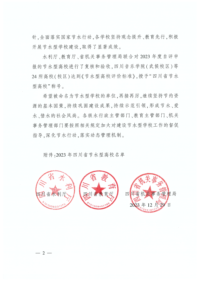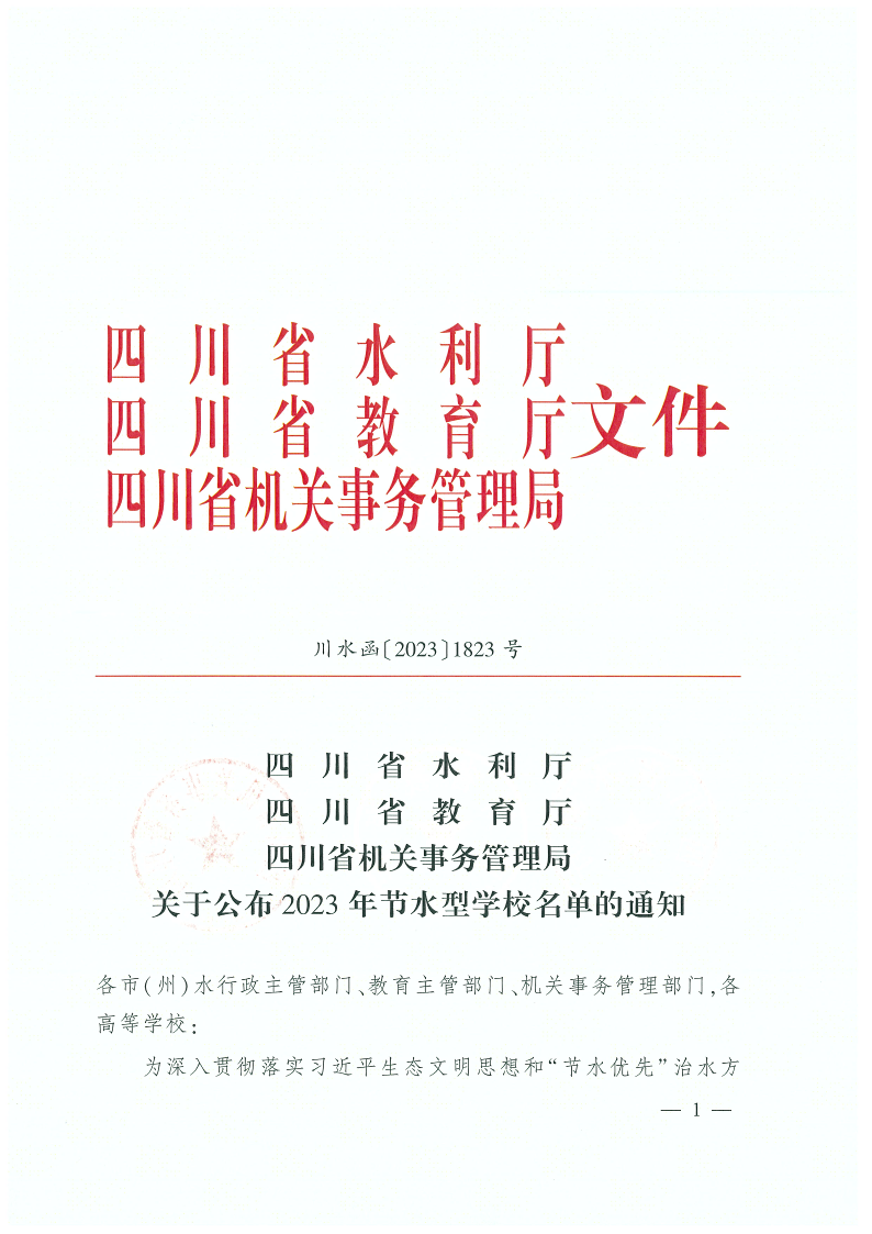 为深入贯彻落实习近平生态文明思想和“节水优先”的治水方针,全面落实国家节水行动。后勤管理处在学校党委的领导下,坚持观念提升,教育先行,主动积极开展节水型学校建设。经过水利厅、教育厅、省机关事务管理局联合对2023年度自评申报的节水型高校进行的复核和验收,我校顺利通过《节水型高校评价标准》,被四川省水利厅、四川省教育厅、四川省机关事务管理局授予“四川省节水型高校”称号。