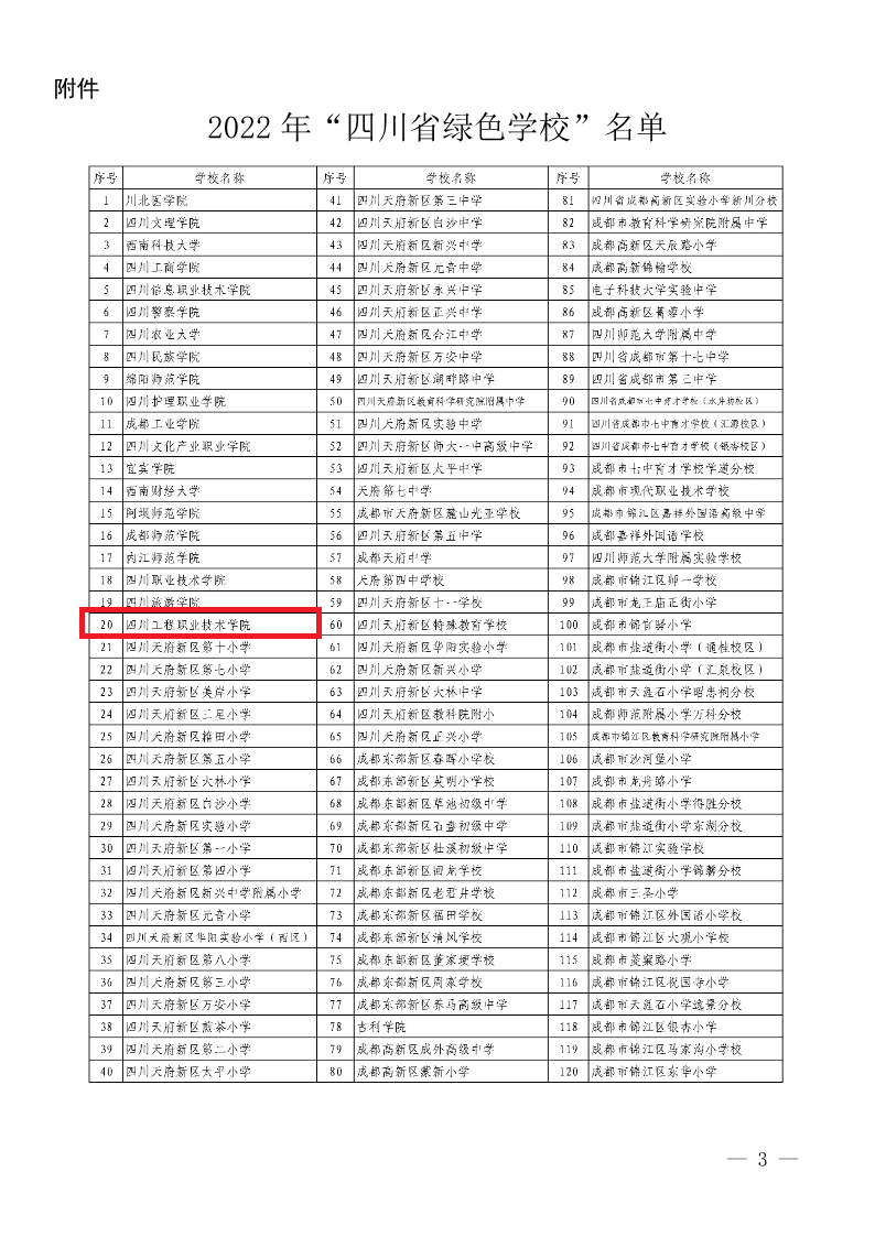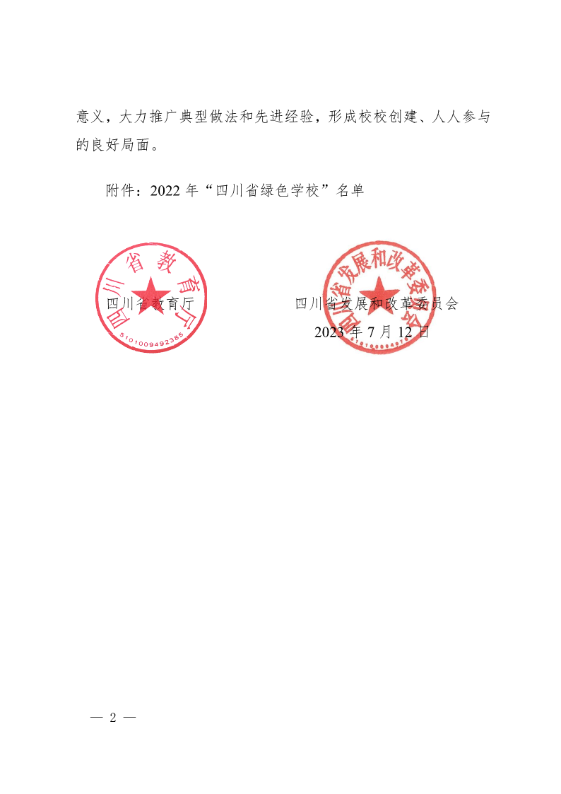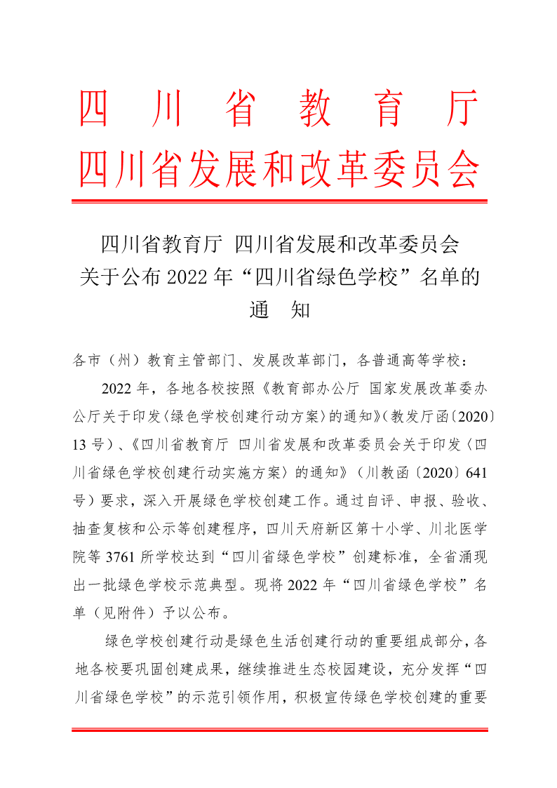 根据《教育部办公厅 国家发展改革委办公厅关于印发<绿色学校创建行动方案>的通知》,后勤管理处在学校党委的领导下,严格按照绿色学校创建标准,深入完善绿色学校的各项准备工作。通过自评、申报、验收、抽查复核等标准创建流程,我校被四川省教育厅、四川省发展和改革委员会确立为“四川省绿色学校”。