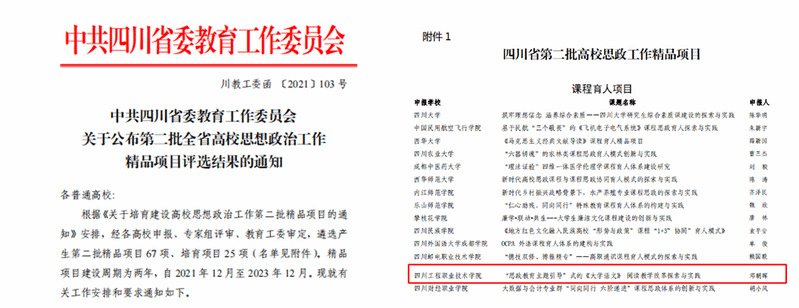 《中共四川省委教育工作委员会 关于公布第二批全省高校思想政治工作 精品项目评选结果的通知》发布,由我校基础教学部邓朝晖副教授牵头的“‘思政教育主题引导’式的《大学语文》阅读教学改革探索与实践”项目获四川省高校思政工作精品项目,是我校在“课程育人”“科研育人”“实践育人”“文化育人”“管理育人”等育人项目上零的突破。