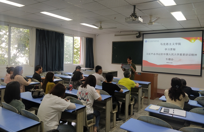 2022年4月28日下午,马克思主义学院党总支在永好楼304教室集中组织全体教职工学习习近平总书记在中国人民大学考察时的重要讲话精神,马克思主义学院党总支书记、院长潘劲主持学习会议。