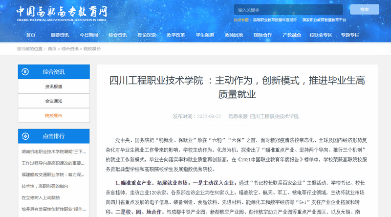 党中央、国务院把“稳就业、保就业”放在“六稳”“六保”之首,面对新冠疫情防控常态化、全球及国内经济形势复杂化对毕业生就业工作带来的影响,学校主动作为,化危为机,探索出了“瞄准重点产业、坚持两个导向、推行三个机制”的就业工作新模式,毕业去向落实率和就业质量再创新高,在《2021中国职业教育年度报告》榜单中,学校荣获高职院校服务贡献典型学校和高职院校学生发展指数优秀院校。