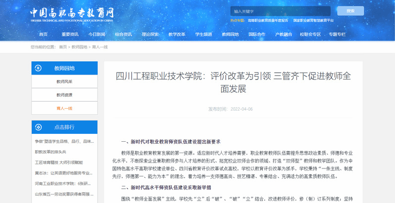 教师是职业教育教育发展的第一资源。适应新时代人才培养需要,职业教育教师队伍需提升思想政治素质、师德和专业化水平,不断探索企业兼职教师参与人才培养的形式、拓宽校企双师合作的领域、打造“双师型”教师和教学团队。作为中国特色高水平高职学校建设单位、四川省教育评价改革试点高校,学校以教育评价改革为抓手,学校秉持“一条主线、制度先行,师德第一、能力为本”的理念,着力培养一支师德高尚、技艺精湛、专兼结合、充满活力的高素质教师队伍。