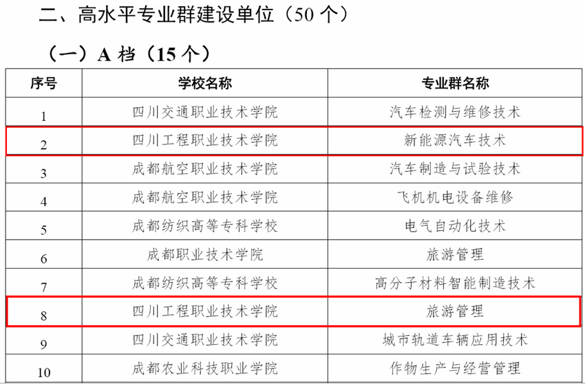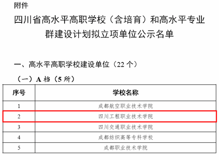 为贯彻落实《四川省职业教育改革实施方案》,根据四川省教育厅、四川省财政厅《关于实施四川省高水平高等职业学校和高水平专业群建设计划的意见》(川教〔2021〕24号)和《关于开展四川省高水平高等职业学校和高水平专业群建设计划项目申报的通知》(川教函〔2021〕86号)要求,按照公平公正、扶优扶强、质量为先、改革导向、合理布局的原则,经高职学校自愿申报,专家组对申报项目进行网络评审、会议评审,教育厅、财政厅审定,拟立项建设22所高水平高等职业学校(含8所“国家双高”建设学校)、50个高水平专业群和15所高水平高等职业培育学校,现予公示。