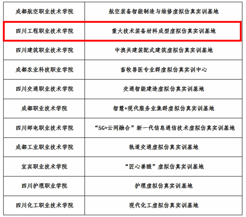 近日,教育部正式公布职业教育示范性虚拟仿真实训基地培育项目名单。根据《关于开展职业教育示范性虚拟仿真实训基地建设工作的通知》,经各省推荐、线上线下专家遴选等程序,确定职业教育示范性虚拟仿真实训基地培育项目215个,其中四川省共有11所高职院校正式入选,名单如下: (消息来源:四川手机报)