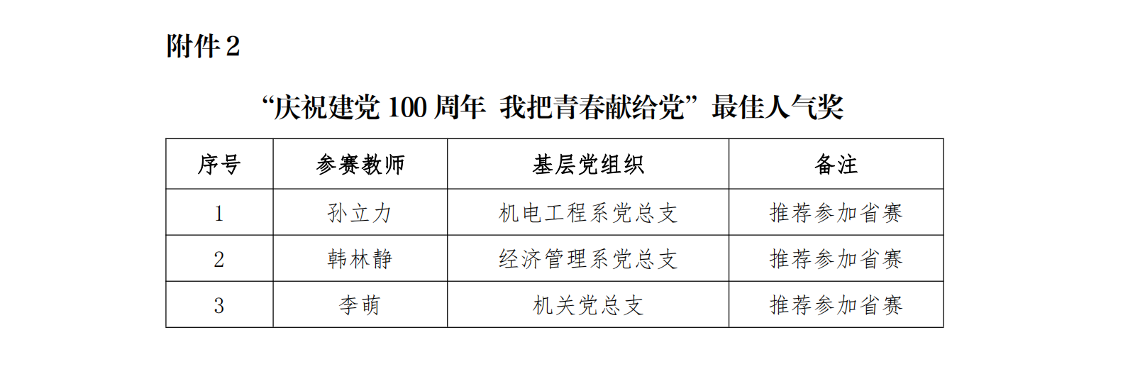 根据《关于开展四川工程职业技术学院青年教师“庆祝建党100周年 我把青春献给党”风采大赛的通知》要求,本次大赛以“庆祝建党100周年 我把青春献给党”为主题,各基层党组织广泛动员推荐,共有60名青年教师积极参赛,展现了学校青年教师的绝佳风采。经评委评审,共评选出一等奖7项,二等奖11项,三等奖12项。其中,7项一等奖进入大众评选环节,投票总数前3名的教师获最佳人气奖并推荐参与四川省教育厅组织的风采大赛。