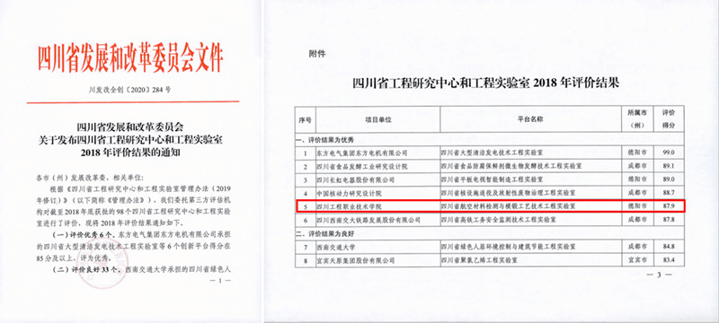 2020年5月26日,省发改委正式发布《四川省工程研究中心和工程实验室2018年评价结果》。此次省发改委按照《四川省工程研究中心和工程实验室管理办法》(川发改高技规【2019】95号),委托第三方机构对全省98个于2018年底前获批的四川省工程研究中心和四川省工程实验室全部进行了年度运行评价。评价结果为:优秀6个、良好33个、合格49个、不合格7个、未提交评价材料3个。