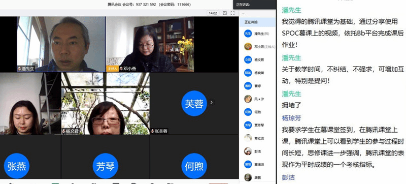 邓小燕讲到,即将开始的《思想道德修养与法律基础》线上教学,已经通过选用中央财经大学国家精品课程搭建了慕课SPOC同步平台,并结合近期教学安排,明确了相关教学要求。会上,各位专兼职教师紧紧围绕线上教学的实际,畅谈心得与体会,交流技巧与方法。韩志敏强调:“线上教学……不必拘泥一种教学形式和教学平台,原则上教师要发挥主导作用,切实加强与学生的互动。”朱秘颖老师说:“要尽量与学生建立一种接近线下教学的体验感,找到适合自己与不同班型学生互动的方法。”张芙蓉老师指出:“腾讯课堂可以通过举手功能和课堂交流区充分实现与学生的线上互动,及时解决他们在学习中遇到的问题和困惑。”兼职教师王静认为:“要结合疫情防控……把党和政府的坚强领导、社会各界的参与、本校师生在疫情防控中的典型经验作为课程教学的鲜活案例。”