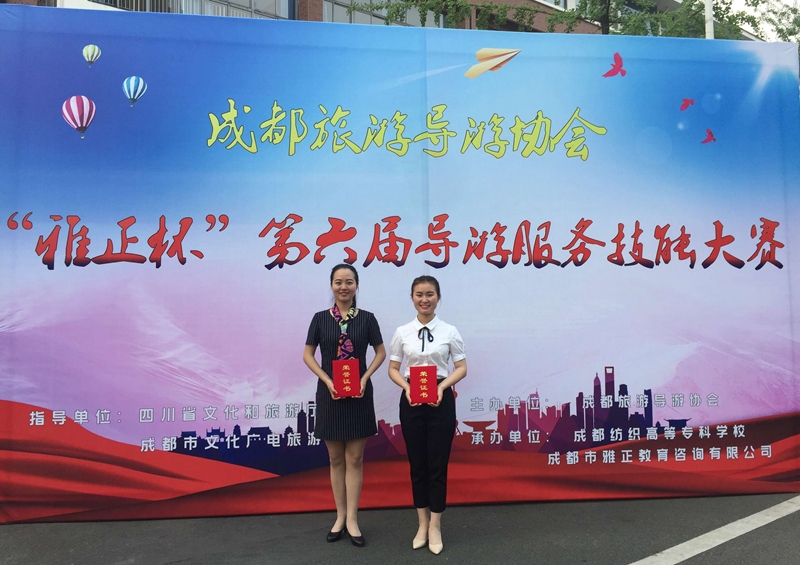 5月25日,由成都旅游导游协会主办、成都纺织高等专科学校承办的“雅正杯”第六届导游服务技能大赛在成都举行。旅游管理系2017级旅游管理专业学生文佳和2018级旅游管理专业学生蒋婉睿代表我校参加了此次比赛。经过激烈的角逐,两位选手均荣获一等奖,我校以团体总分第一荣获团体一等奖。