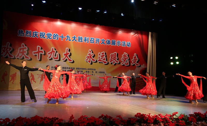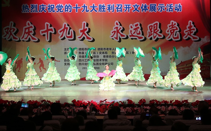 德阳市各县(市、区)文体局、各县(市、区)老年人体育协会、德阳市级系统老年人体育协会、老年人体育协会分会(队)带来的文体展示活动以“欢庆十九大,永远跟党走”为主题,用丰富多彩的文体节目,展示了老年同志对新时代的热爱和希望。