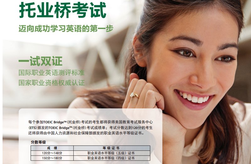 托业桥 (TOEIC Bridge) 考试是由美国教育考试服务中心(ETS)为英语初学者和中等水平的英语学习者设计的考试项目,即职业英语初、中级水平的考试。适合的考试对象主要是职业院校学生和具有同等水平的在职人士。托业桥(TOEIC Bridge)考试题目是针对全球语言环境与各种不同的日常生活情境而设计的,没有固定范围,包括活动、就餐、娱乐、家人与朋友、普通商务、健康医疗、住房、办公、新闻、学校、购物、旅行等各方面话题。