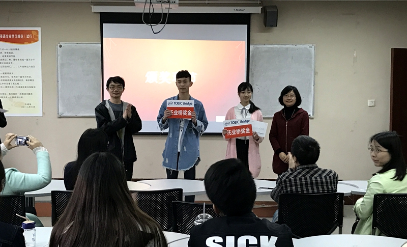 2017年4月6日下午,二教语言中心1教室隆重举行TOEIC Bridge (托业桥)颁奖典礼,共21名同学荣获奖励基金。外语系副主任苏玉仙教授致辞,衷心祝贺并希望同学们能再接再厉,永攀知识高峰。获奖同学代表黄琪发言,曾是单招生的她面对考试并不抱希望,但深受老师鼓励和通过其自身努力,取得了全校第一名的优异成绩。她表示“托业桥”考试对自己现阶段学习和以后就业意义重大。