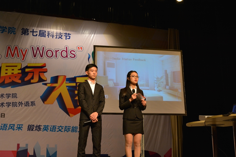 本次大赛分初赛和决赛两个阶段,共有来自全校34个团队的200多名学生报名参加。经过初赛的激烈角逐,10个跨专业、跨年级组合的团队晋级决赛。决赛通过“科技作品展示”、“与外教现场交流”和“英语经典朗诵”三个环节展示。