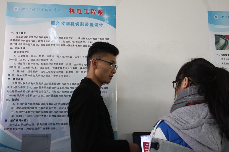 师生们一边仔细观看展板和实物展示一边相互交流,有的学生主动向项目负责同学学习创新项目应如何构思、如何实施;有的老师主动询问项目成果后期的推广情况,并提出了建议;有的同学拿出手机不停地拍照记录;教师们也三五成群地在一起交流指导学生创新创业活动的心得体会。整个活动持续了3个小时,师生参与积极性高、现场气氛活跃,完全达到了预期目的,得到了招生就业办公室和科研处的肯定,也必将推动机电工程系的创新创业工作向前迈进一大步。