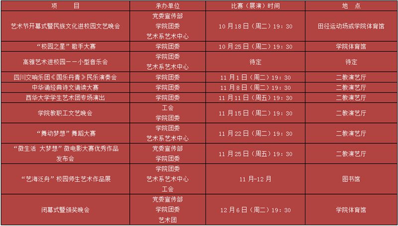 展示项目中涉及开幕式暨民族文化进校园文艺晚会、四川交响乐团《国乐丹青》民乐演奏会、高雅艺术进校园—小型音乐会、西华大学学生艺术团专场演出、学院教职工文艺晚会、 “艺海泛舟”校园师生艺术作品展、闭幕式暨颁奖晚会。