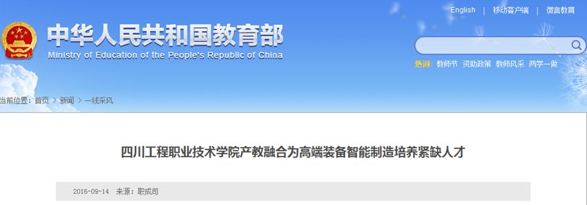 近年来,我院紧紧围绕区域和产业发展战略,搭建产学研平台,校企深度合作,创新人才培养模式,持续推进“一个机制,两个体系”各方面建设取得了巨大成效。9月14日,教育部网站、四川省教育厅网站以“四川工程职业技术学院产教融合为高端装备智能制造培养紧缺人才”为标题对我院的创新做法进行了报道。