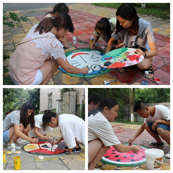 原来这是学院团委会宣传部发起的一项“我为校园添色彩”的活动,团委会的同学和各系团总支的小伙伴们顶着炎炎烈日,用巧手装点了一个个不起眼的井盖。他们表示,一方面希望给校园增添些靓丽的颜色,另一方面想给返校参加毕业典礼的大三学长学姐们一个惊喜,让他们带着对美好校园的回忆踏上新的旅程。
