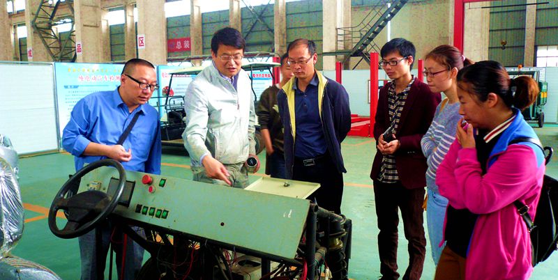 简短的交流后,老师们进行实地参观。首先,老师们走进公司生产现场,了解了电池装配的基本工艺。在锂电池高低温交变湿热试验室,陈总向老师们介绍了该试验项目在电池检测与电池充放电智能化管理控制的作用。最后,老师们来到纯电动汽车检测维修中心,详细了解纯电动汽车的电池与电控装置检测保养的程序。