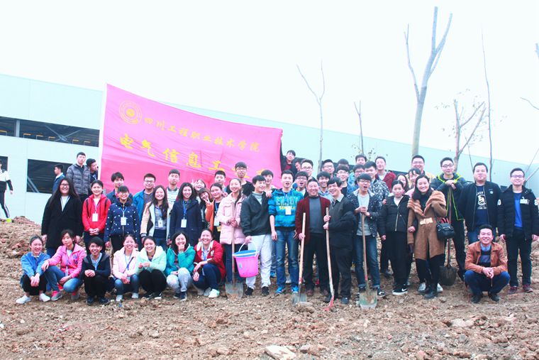 南区远远望去,一片热火朝天的景象。学院领导也和师生们一起植树培土,师生们手持铁锹和水桶,干劲十足,将一棵棵充满生机的树苗植入坑内,种完树后,同学们又为树苗精心培土浇水。