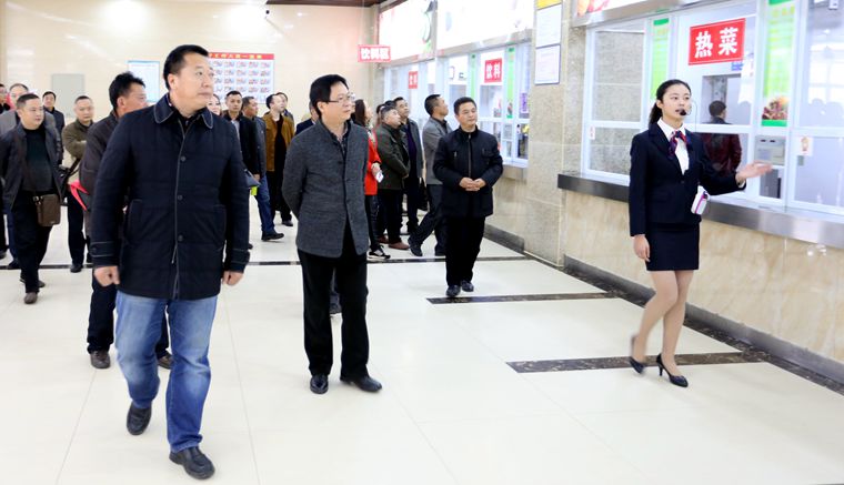 与会领导与代表在学院副院长倪波陪同下参观学校食堂并观摩学习运行管理情况