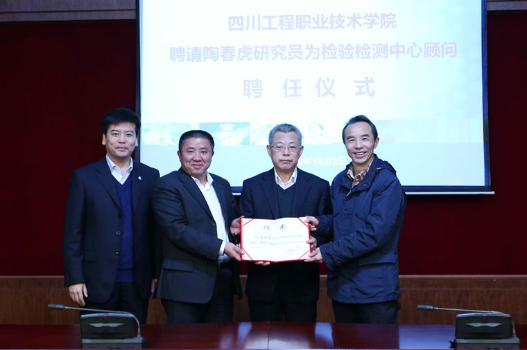 李登万院长代表学院向陶春虎先生颁发了聘书,并发表了热情洋溢的讲话,讲话对陶春虎研究员表示感谢,同时强调我院始终坚持“体制创新、开放办学”的理念,以“建高水平国家示范院校”为奋斗目标,通过与行业、企业共建产学研平台,全面提升人才培养、应用技术研究、服务社会、文化传承创新的能力,尤其是通过检验检测中心的建立,不仅可以利用这个平台为社会培养、培训更多符合行业企业需要的优秀人才,还能为高端制造、产品的转型升级提供支撑。李院长表示,陶春虎研究员的加盟将极大地促进我院检验检测中心实力的提升,希望陶春虎研究员给我院带来更多的思想光辉,播撒更多的智慧种子,为我院检验检测中心乃至材料学科的发展提出更多宝贵的意见和建议。