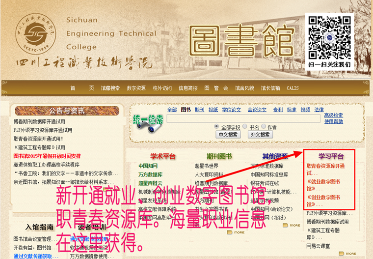 图书馆网站是读者了解图书馆的门户,是图书馆与读者交流互动的桥梁,也是展示图书馆形象的网上窗口。为了方便读者更加快捷地获取图书馆的信息资源,向读者提供及时、快捷的信息服务,促进大学生创新创业,图书馆新引进(试用)了“创业数字图书馆”、“就业数字图书馆”、“职青春资源库”等资源,不断完善图书馆数字资源建设。目前,图书馆对馆网站进行了升级改版,初步实现了信息宣传、资源揭示、个性化服务等功能,更加方便读者利用图书馆的资源和服务,获取创新创业数字资源,为大学生创新创业提供信息支撑。接下来,图书馆将进一步扩大宣传,加大数字资源使用培训,更加贴近读者需求。(文/图书馆)