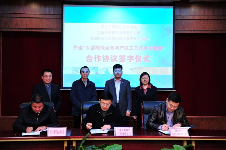 李登万院长、陈晓慈副总工程师和周京平总经理代表三方签署了《三方合作框架协议》。宋晓辉书记代表中航工业北京航空材料研究院检测中心向实验室的成立表示祝贺。宋书记强调,大型模锻设备与产品工艺技术实验室的成立是四川工程职业技术学院与中国二重万航模锻有限责任公司和成都航天龙宇质检技术有限责任公司深度校企合作的开始,并应该以此为契机,探索校企合作新模式和产学研结合的技术创新体系。航天梦是中国梦的一个重要组成部分,航天事业将进一步发展。该实验室要抓住这一机遇,为航天事业做出更大的贡献,为航天事业培养高级人才。合作企业的领导分别做了发言,纷纷表示愿意为了实验室的发展,竭尽所能提供技术和人员等各方面的大力支持。