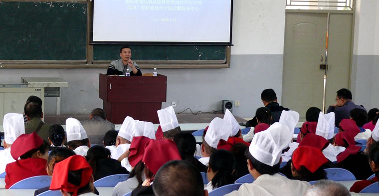 10月14日,德阳市食品药品监督管理局与学院后勤服务中心联合开展了食品安全知识专题培训。本次培训由食品安全管理专家、德阳市食品药品监督管理局经开区分局食品监督科科长杨洪刚主讲。全院各食堂、特色小吃区、清真餐厅的全体员工,后勤服务中心领导、食品安全员、仓库管理员、货物收验员以及学生代表约170人参加了本次专题培训。