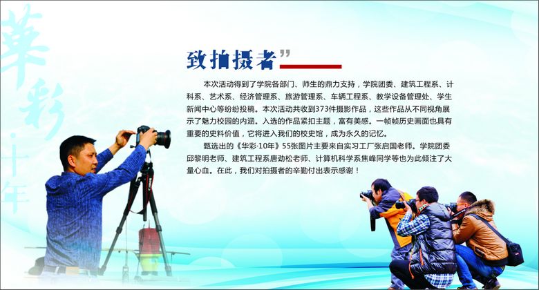 在学院建校55周年之际,学院于10月23日在风雨操场西侧橱窗、图书馆中厅举办了《华彩•十年》主题摄影展。