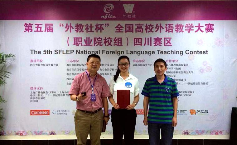 2014年6月21日至22日,“第五届‘外教社杯’全国高校外语教学大赛(职业院校组)”四川赛区决赛在成都纺织高等专科学校落幕。来自省内各高职高专院校32名英语专业教师经学校初赛选拨进入赛区复赛。大赛产生了特等奖1名,一等奖2名。经过激烈角逐,我院外语系王烽力老师最终获得四川赛区决赛一等奖。 外语系王榛 供稿 冯建荣 编辑