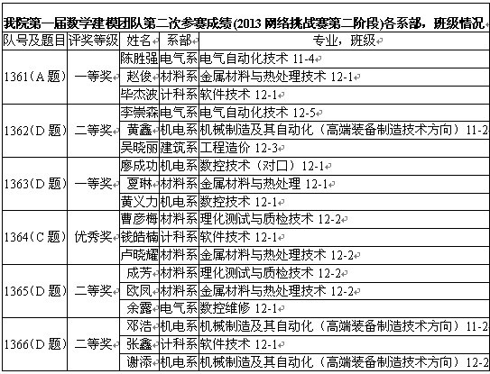 2013年第六届“数学中国”数学建模网络挑战赛第二阶段(高级篇)比赛结果于6月18日公布。此次比赛共有26个省市自治区160所高校的近1050个队伍报名参赛。我校基础部数学教研室老师指导参赛的6支队伍中,2支队荣获一等奖,3支队荣获二等奖,1支队获得优秀奖。