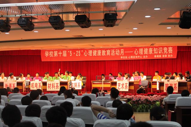 5月28日晚7点半,学生处心理咨询中心、基础教学部、团委联合在新图书馆3楼多功能会议厅举办了一场内容丰富的心理健康知识竞赛活动。来自我院十个系的参赛学生代表30名列坐在台上,经过比答题、抢答题、风险题和互动题4个环节的激烈比赛,建筑系代表队获一等奖,旅游系、机电系代表队获二等奖,车辆系、材料系、艺术系获三等奖,经管系、外语系、计科系、电气系代表队获优秀奖。