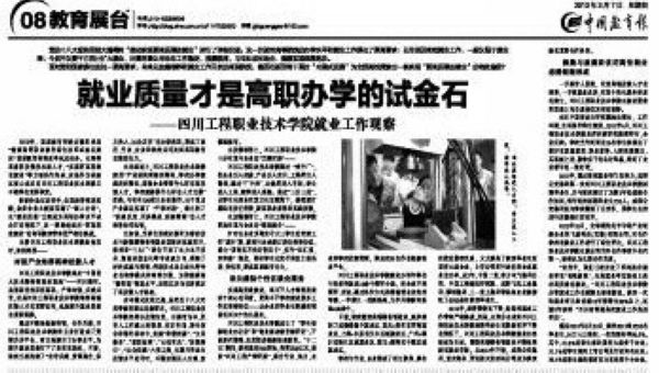 3月7日,中国教育报以《就业质量才是高职办学的试金石——四川工程职业技术学院就业工作观察》为题,报道学校面对严峻的就业形势,以“对接产业培养高端技能人才”、“双向提供个性化就业服务”为途径,一手抓育人质量,注重高端技能人才的培养,一手抓就业品牌,注重个性化服务体系的建立,毕业生就业呈现出“数量与质量双优的高位就业态势逐渐形成”的良好局面,为全国高校探索出了一条实现“更高质量的就业”的有效途径。