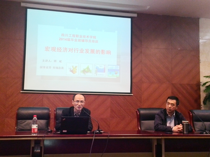 就业办邀请到德阳国金证券胡斌总监到会主讲。胡总监以十八大和全国两会的背景资料,以当前及今后一个时期中国经济发展的脉络为主线,分析了国家七大新兴战略产业、新兴支柱产业等的发展机遇,并结合我校相关专业毕业生就业及发展问题作出了自己的分析。
