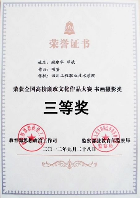 近日,我校艺术系谢建华、邓斌老师获得全国高校廉政文化作品大赛三等奖,这也是四川省高职院校代表在本次比赛中获得的最好成绩。