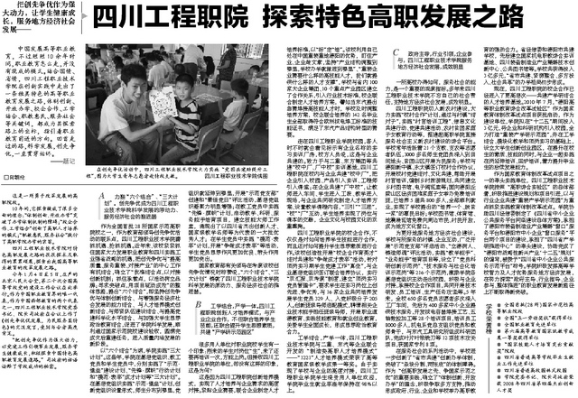“把创先争优作为强大动力,让学生健康成长,服务地方经济社会发展——中国发展高等职业教育,不过短短10余年时间,职业教育怎么走,并没有现成的模式。结合国情、省情,摸着石头过河,四川工程职业技术学院走出了一条中国特色的高等职业教育发展之路,体制创新、开学办学、校企合作、工学结合、职教惠民、服务社会等关键词,成为其探索路上的一座座坐标,指引着中国职业教育前进的方向。回首走过的路,科学发展,创先争优,一直贯穿这条路的始终·······”