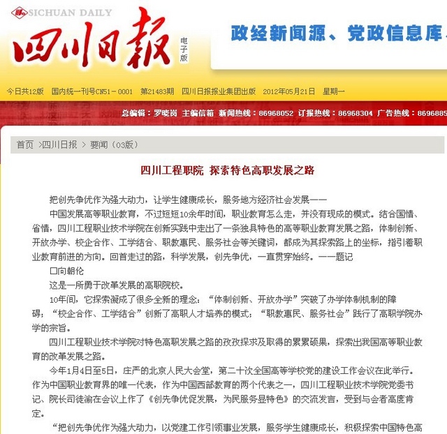 2012年5月21,《四川日报》发表专题文章《四川工程职院,探索特色高职发展之路》,介绍了我校以党建工作引领事业发展,将创先争优作为科学发展的源动力、服务经济社会的推进器,服务学生健康成长,积极探索中国特色高职教育发展道路的成功经验。