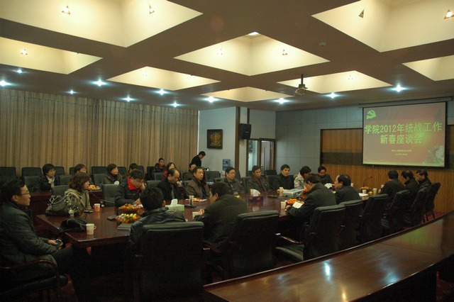 2012年1月5日,我院2012年统战工作新春座谈会在技术中心会议室召开,学院各民主党派代表、人大代表、政协委员、少数民族代表、侨眷代表、无党派人士代表等30余人欢聚一堂,共庆新春佳节。学院正院级调研员吴烈、党委副书记张斌出席座谈会。学院党委组织部、统战部部长邹显国主持座谈会。
