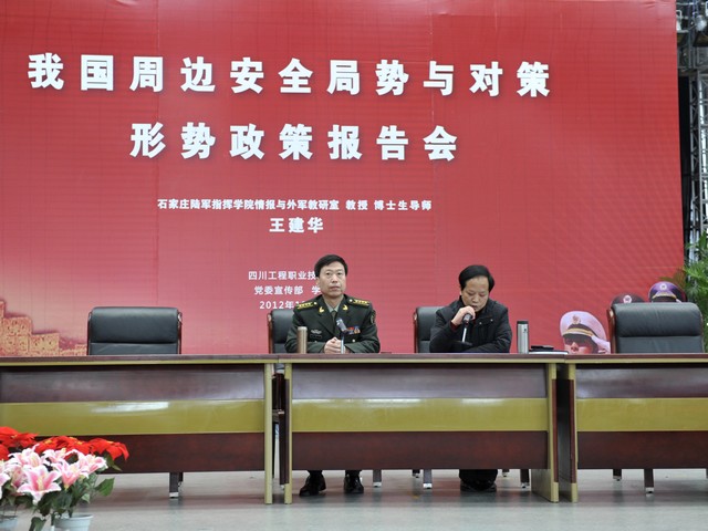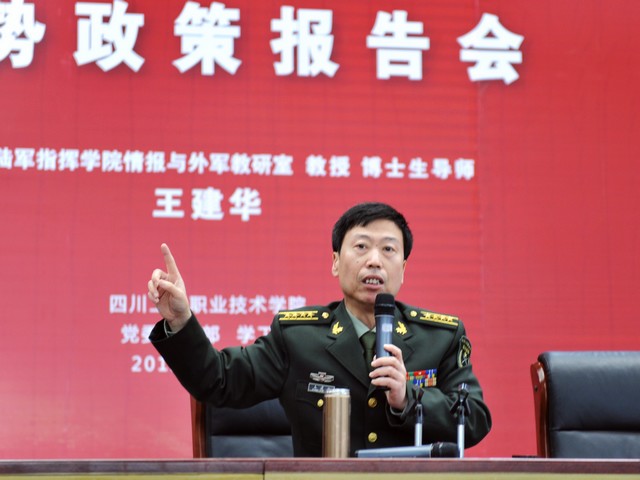 本次报告会是学院为了让师生正确认识当前国际国内形势,深刻领会中央对内对外的重大决策和部署,进一步增强建设祖国、保卫祖国的历史责任感而特邀专家进行的爱国主义形势政策报告会。王建华现为石家庄陆军指挥学院情报与外军教研室教授、博士生导师,曾因多次建立战功,被评为“总参英模”、“全军教书育人优秀教员”、“全军优秀教师”等,曾先后主编和参与编写了《外国军事战略研究》、《网络战》、《外(台)军作战研究》、《外国及台湾地区军事战略研究》等著作10部,发表文章100余篇,2002年被国家安全部聘为“名誉教授”,2005年先后被解放军国际关系学院聘为“名誉教授”、被北京市社会科学院聘为“特邀研究员”。他曾先后出访过欧洲、亚洲等十余个国家,在全国举办讲座600余场,广受好评。