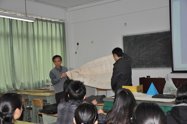 时针慢慢指向2点30分,听课老师陆续来到教室。杨跃教授走到老师中,亲切地与之交谈,了解情况。2点30分整,铃声响起,杨教授面带微笑从容地站上了讲台,他从“上节课的作业”谈起,讲述了如何布置批改画图作业、提高学生画图积极性和水平的故事,并向大家展示了二十多年前他在工程学院就读时的毕业设计图纸。杨教授示范课的内容是“正投影基础”,他利用一块木板和投影仪的光,生动地演绎了正投影的“三性”,并示范如何引导学生讨论。45分钟的示范课在杨教授生动活泼的语言、抑扬顿挫的语调、热爱教育的激情中行云流水的展开,在他严密的逻辑、简洁的归纳中结尾。学员老师凝听着、感受着、记录着、思考着。